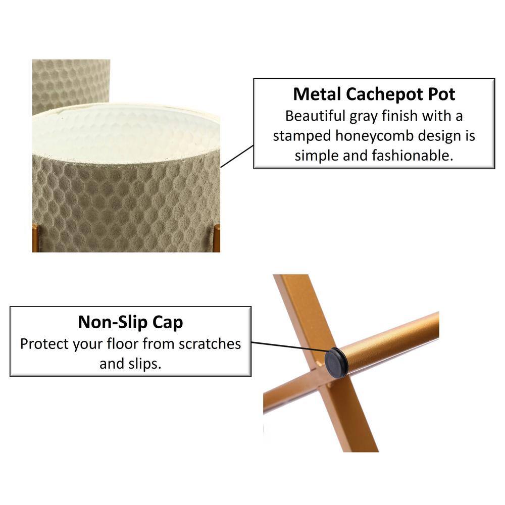 Elevate your greenery in this gorgeous metal cache pot set with a dimpled design in a grey finish, and a stand in gold finish. Each metal container fits easily on a gold finish stand, and fits with any style. The containers can be used as cache pots for your planters. The set includes a large and small planter that are identical in style and finish. The planters are ideal for showing off your indoor plants as cache pot. The metal containers are not waterproof.