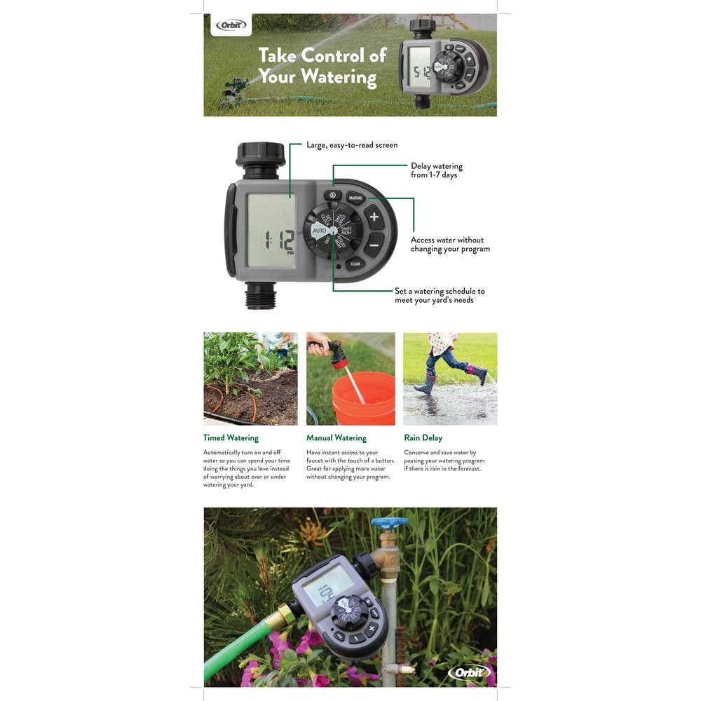 The Orbit 1-Outlet Electronic Watering Timer will turn your hose faucet into a programmed sprinkler system in minutes. No more dead plants because you forgot to water them. No more soggy lawns because you forgot to turn the water off. Just set the timer and go. With a large digital display, easy program dial and simple controls, programming is fast and easy. Built with high quality materials and water-resistant construction you can count on many years of dependable service. Simply install a hose faucet timer to any standard outdoor hose faucet and program it to water at your convenience. Program it to water during ideal times to minimize evaporation and save yourself time and money while making your yard lush and green.